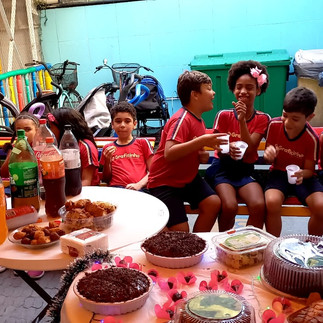 Os alunos do Fundamental 1 participaram de um lanche coletivo e amigo oculto de chocolate. Já a galerinha da Educação Infantil participou de brincadeiras e recebeu presentes do Papai Noel.